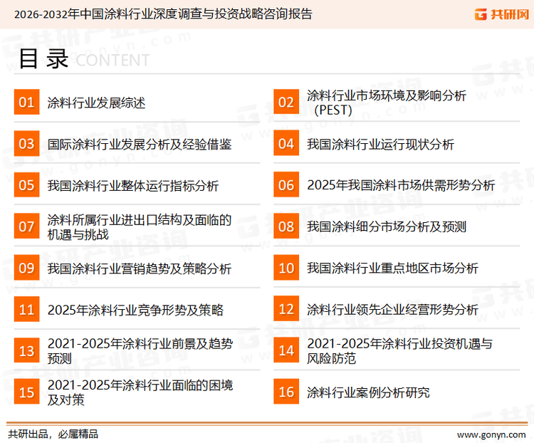 共研网发布的《2026-2032年中国涂料行业深度调查与投资战略咨询报告》共十八章。首先介绍了涂料行业市场发展环境、涂料整体运行态势等,接着分析了涂料行业市场运行的现状,然后介绍了涂料市场竞争格局。随后,报告对涂料做了重点企业经营状况分析,最后分析了涂料行业发展趋势与投资预测。您若想对涂料产业有个系统的了解或者想投资涂料行业,本报告是您不可或缺的重要工具。