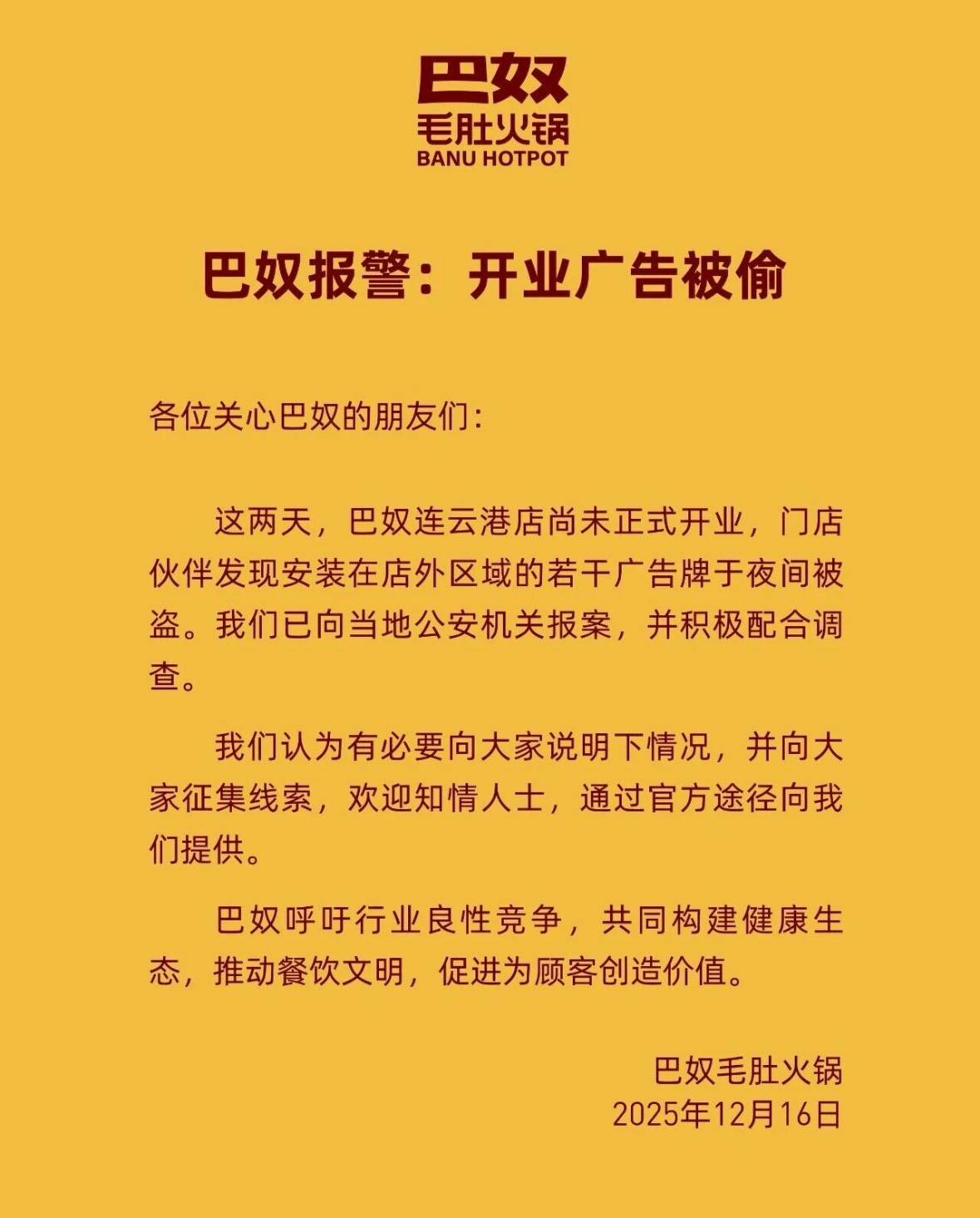 12月16日17时59分,巴奴毛肚火锅官方公众号发文称,“这两天,巴奴连云港店尚未正式开业,门店伙伴发现安装在店外区域的若干广告牌于夜间被盗。”此事引发广大网友关注。同时文中提到,巴奴毛肚火锅官方已向当地公安机关报案。