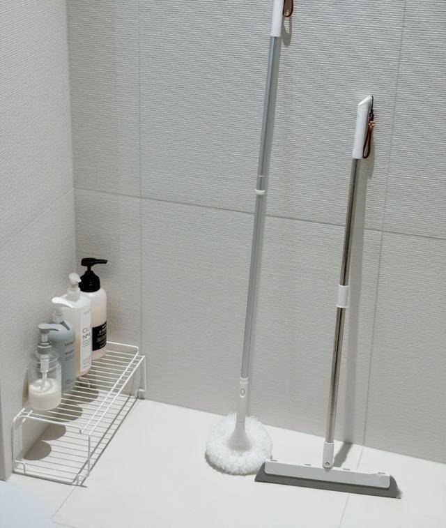 如果家里实在没有地方放清洁工具,必须放在卫生间,那么清洁工具也不要直接放在地上,悬空收纳,可以避免清洁工具发霉、滋生细菌。