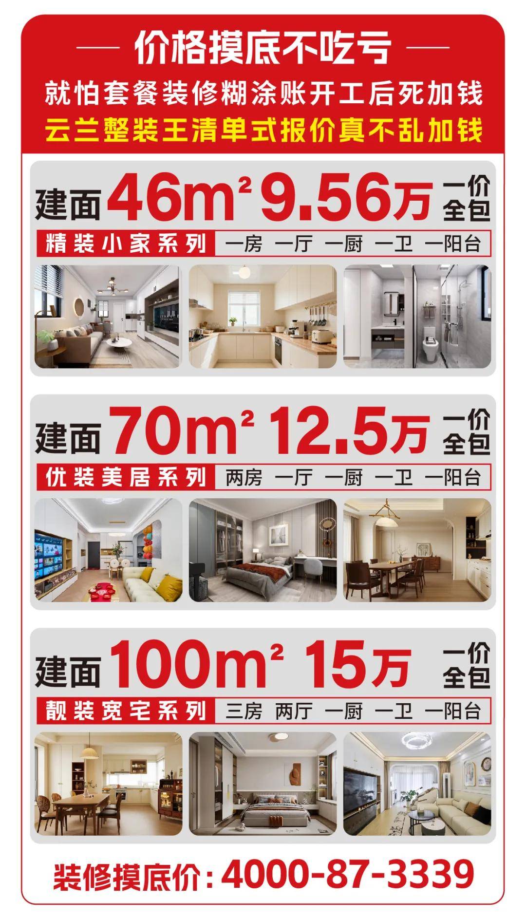 云兰整装王能深刻理解业主的被动情况。通过总结装修行业“低开高走”“增项加钱”的原因,针对不同户型推出基于上海装修市场行情的装修报价,并以清单式整装预算为依据,承诺“10免10包12不限 32项真全包 不加钱”,保障给到的套餐报价,就是完工后的装修总花费。