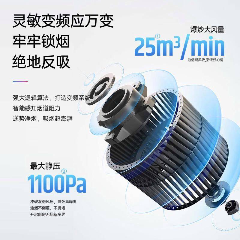 传统油烟机通常只有固定档位,要么风力太小吸不净油烟,要么风力太大产生恼人噪音。这款产品搭载的智能变频电机能够根据油烟量自动调节转速,就像一位贴心的厨房助手,总能恰到好处地应对各种烹饪需求。