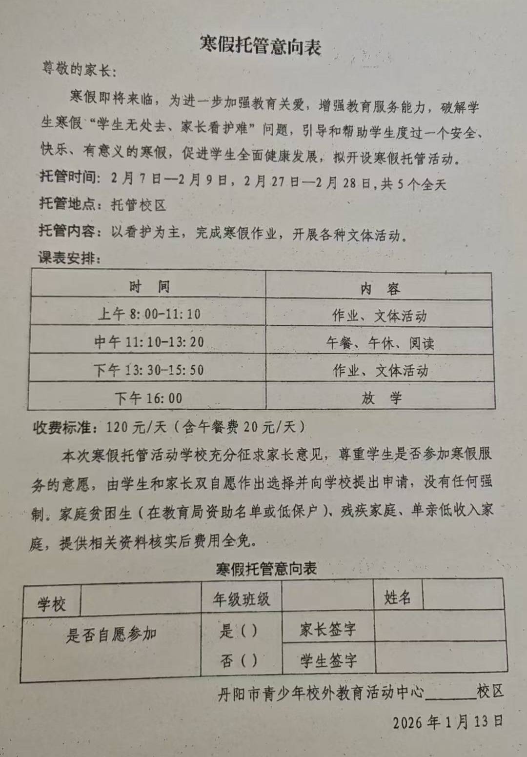 意向表明确注明,托管活动充分征求家长意见,尊重学生与家长的自愿选择,无任何强制要求;家庭贫困生(教育局资助名单内或低保户)、残疾家庭及单亲低收入家庭,经相关资料核实后可费用全免。