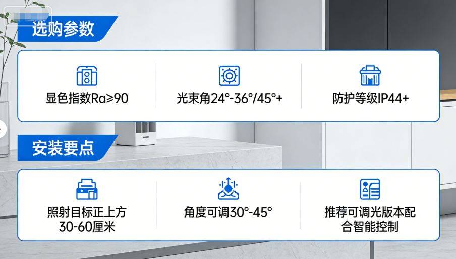 光束角根据使用场景选择,商品展示宜用24°-36°中等光束角,装饰照明可用45°以上宽光束角;防护等级根据安装环境选择,潮湿环境需IP44以上防护。
