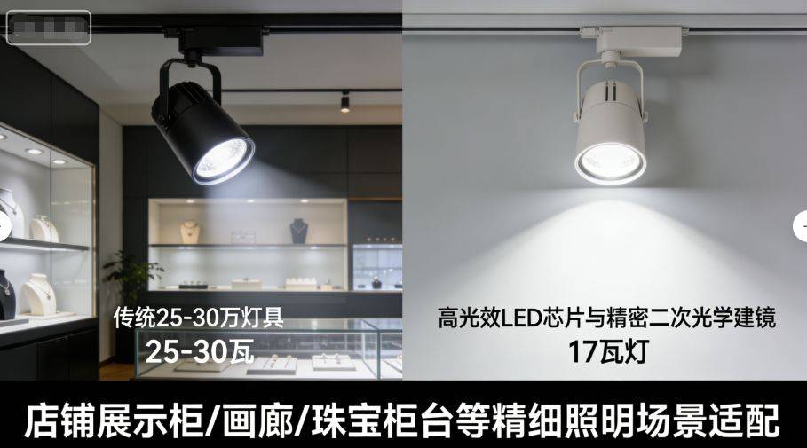17瓦轨道灯的专业适配方案 在零售店铺中,17瓦轨道灯常被用于商品陈列架的局部照明,特别是珠宝、化妆品、工艺品等需要精细展示的商品。