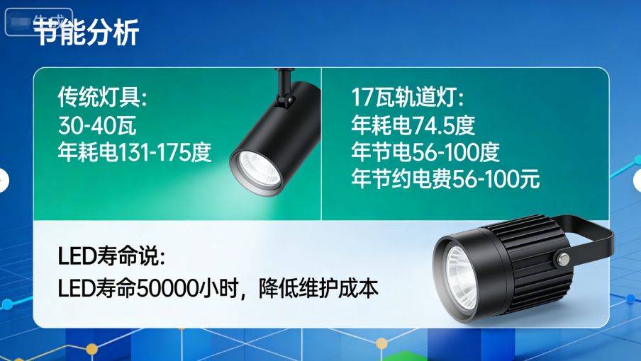 节能效益计算:17瓦轨道灯的经济性分析 以每天使用12小时计算,17瓦轨道灯的年耗电量约为74.5度电,而同照度要求的传统灯具通常需要30-40瓦功率,年耗电量可达131-175度电。