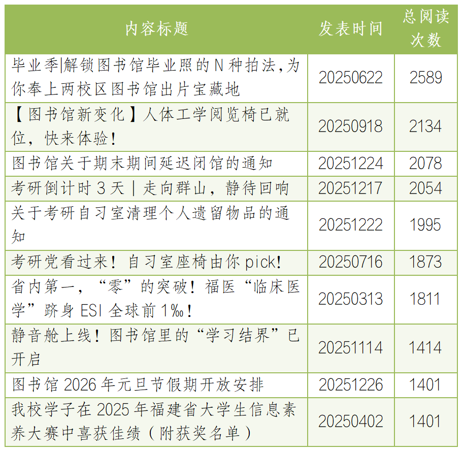 在这些推文中,“毕业季|解锁图书馆毕业照的N种拍法,为你奉上两校区图书馆出片宝藏地”“【图书馆新变化】人体工学阅览椅已就位,快来体验!”、“图书馆关于期末期间延迟闭馆的通知”、“考研倒计时3天|走向群山,静待回响”、“关于考研自习室清理个人遗留物品的通知”等推文最受读者欢迎,阅读量均达到1000+。