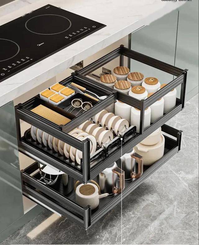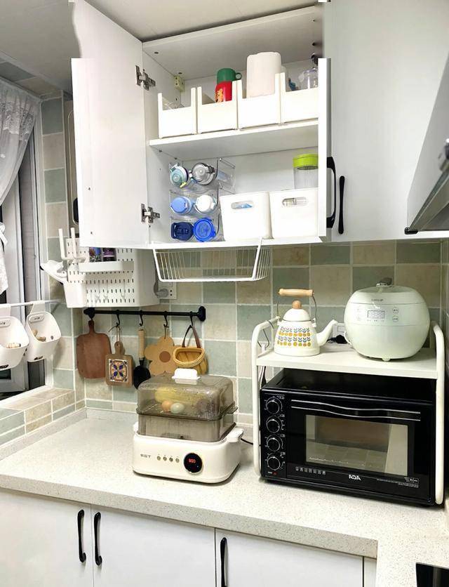 - 神操作5:吊柜空间别浪费。吊柜高处够不着?用一个下拉式拉篮就能解决,轻轻一拉,柜内物品送到手边,对个子矮的朋友和长辈特别友好。预算有限的,就在吊柜下层放每天必用的碗盘,上层放不常用的囤货。