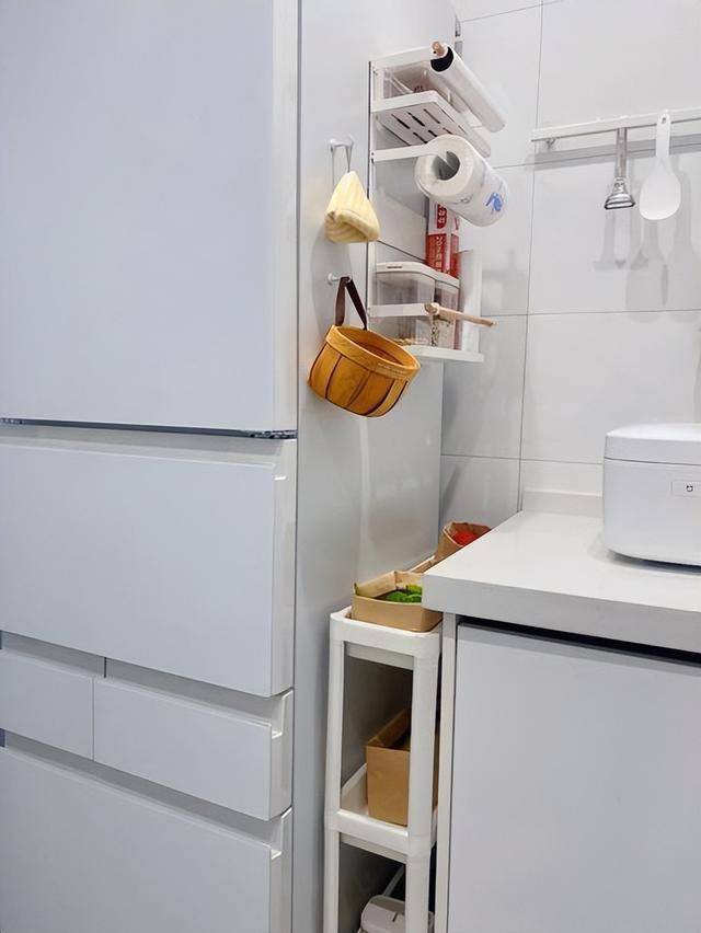 - 神操作6:巧用“缝隙神器”。冰箱和橱柜之间那点缝,买个窄缝小推车,放饮料、零食、杂粮,完美利用。橱柜之间的窄缝,也有专用的超薄夹缝柜,收纳力惊人。