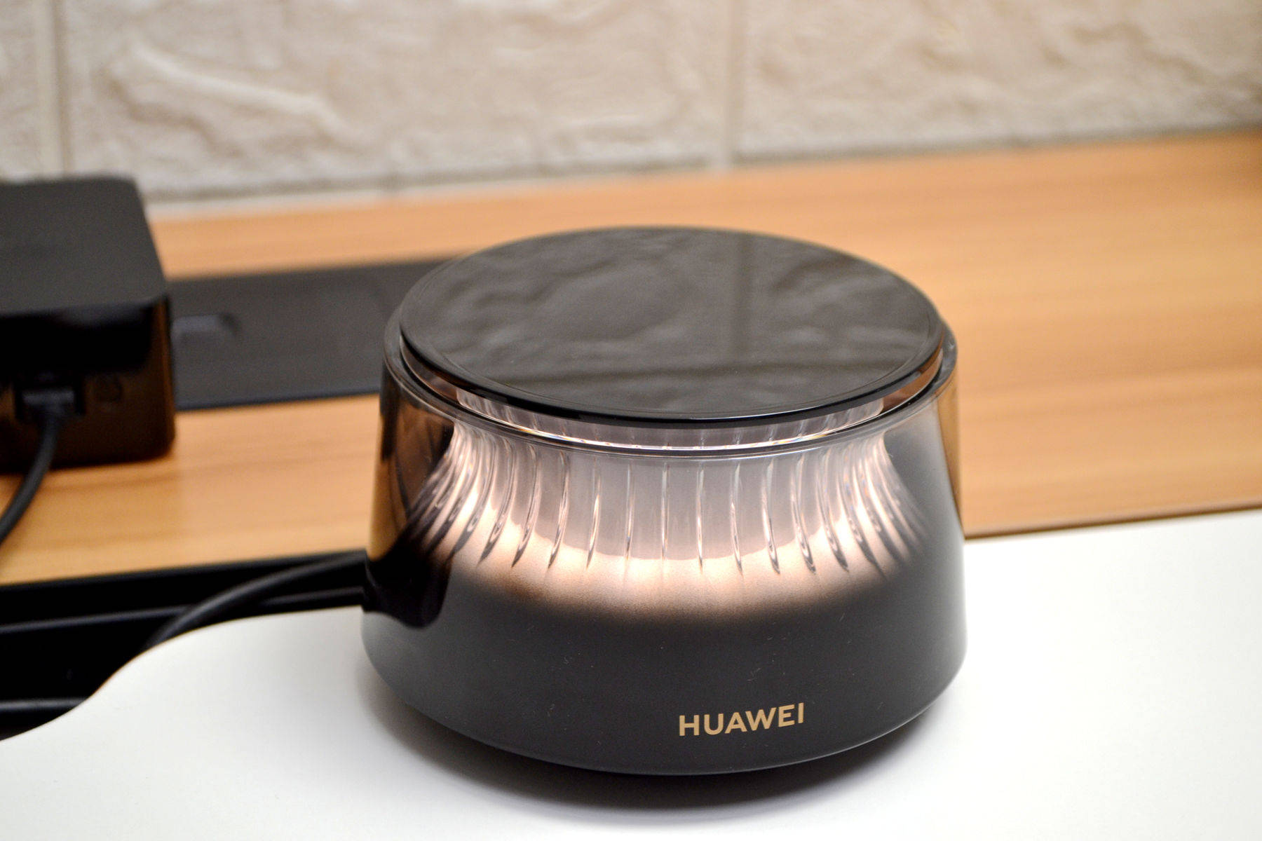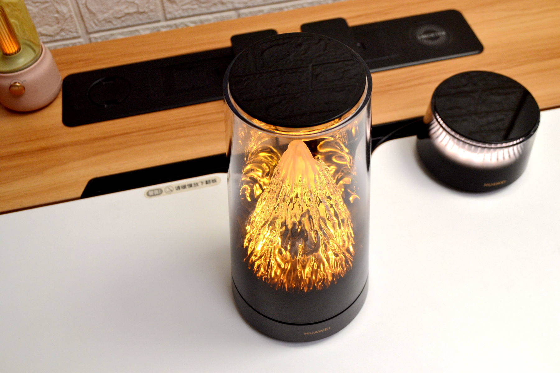 外观方面,华为日照金山X3 Pro完全打破了我们对传统路由器的认知,做得是真的好看,看不到天线,母路由是个圆柱形机身的渐变透明外壳,里面藏着一座微缩雪山,山体据说是用了500多道复杂曲面,光线一透过来,山体的纹理和起伏感做的特别好,特别好看。路由器不管摆在客厅茶几还是书房的书桌,都好看。
