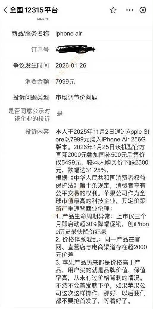 有用户在网上发帖称,自己已向12315发起投诉,要求退还差价。