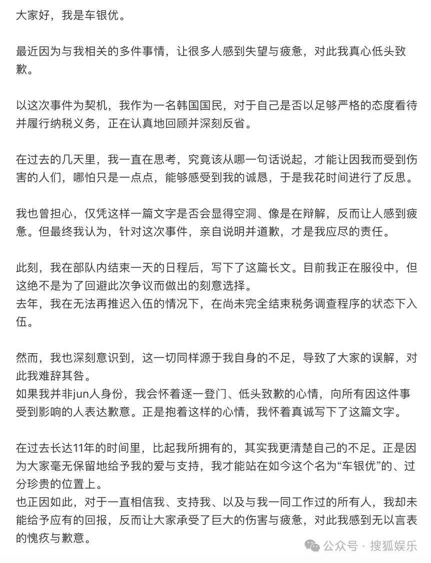 直到1月26日晚上,车银优突然配上一张全黑图片,发布了一封格式工整、语气沉重的亲笔信。
