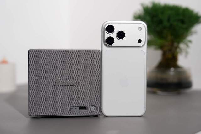 实物拿在手上,比我预想的还小。放在电视柜上,尺寸只比我的17 Pro Max略厚一些,比传统NAS小了近一半,完全不占地。这得益于它的一体成型工艺,去掉了传统外框和支架,把空间真正还给了用户。