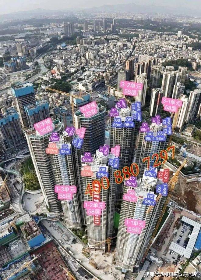 项目由8座建筑分2排组成,1栋1-2-3单元和3栋1-2单元为58-59层(约180米)住宅,标准层高2.9米,4梯6户;4栋1-2单元为35层(约165米)写字楼,2栋为幼儿园。地块住宅均为商品房性质,有1566户,配2220辆车位。