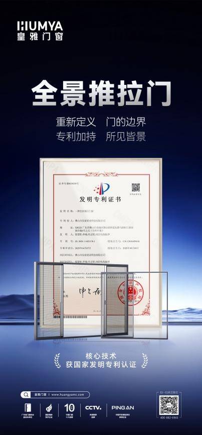 皇雅门窗全景推拉门核心技术获国家发明专利认证,这项突破性创新充分彰显了门窗一线品牌的技术实力,重新定义门的边界,实现"所见皆景"的空间体验。