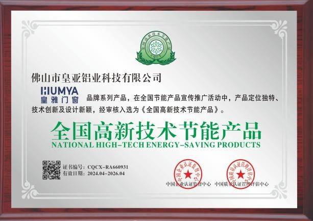 皇雅门窗坚持绿色智造路线,产品获“全国高新技术节能产品”认证,展现出门窗一线品牌在节能环保领域的责任担当与技术领先性。