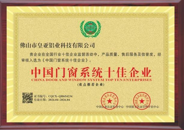 获评“中国门窗系统十佳企业”,体现出业界对皇雅门窗系统化能力的充分肯定。作为门窗一线品牌代表,其在工艺、设计和服务方面的集成能力屡获好评。