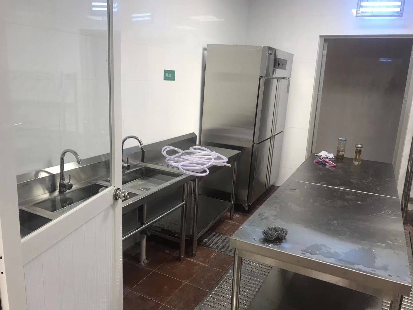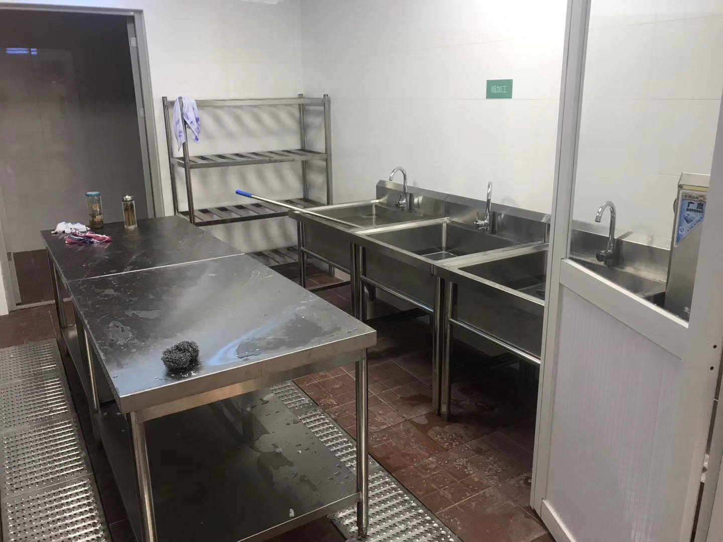 粗加工区:设备应靠近厨房入口,设置独立的肉类清洗池和蔬菜清洗池(三星水池),严禁混用。