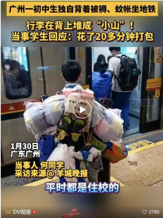 1月30日,广州中小学迎来寒假。在广州地铁7号线长洲站,有市民拍到一名学生独自背着鼓鼓囊囊的行李候车,被褥、蚊帐、运动鞋、拖鞋层层叠叠,甚至还有一只被行李完全包围住的“大湾鸡”。这名学生哥的背影几乎被身上堆成小山的行李吞没,背包带也深陷进他的肩膀。