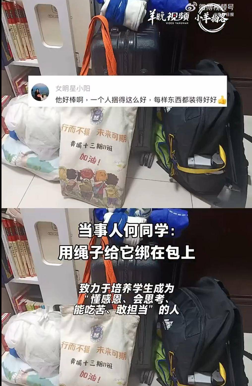 虽然映入我们眼帘的,只是这个孩子候车时的场景,但是从他淹没在“行李山”里的身影中,却能看到镜头之外的过程。20多分钟的打包整理,虽然看上去不算整整齐齐,但也算是有板有眼,其中包含了同窗间互帮互助的淳朴友谊,少年们不等不靠的协作精神。而这份能力并不是与生俱来的,是学校管理风格的潜移默化,是“允文允武,惟德惟才”办学理念的生动体现。比起现在常见的家长、学校“全程包办”的呵护,这种鼓励和培养学生自立自强的教育,才是给予孩子最珍贵的成长礼物。