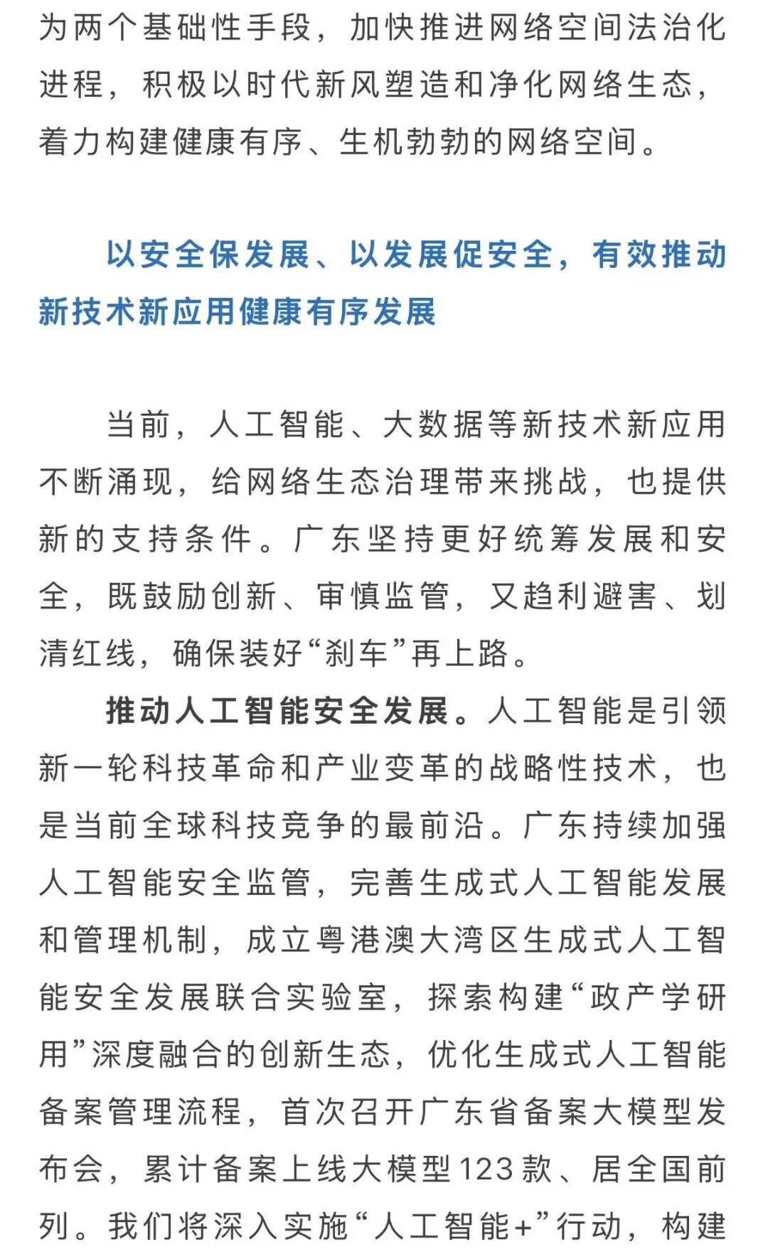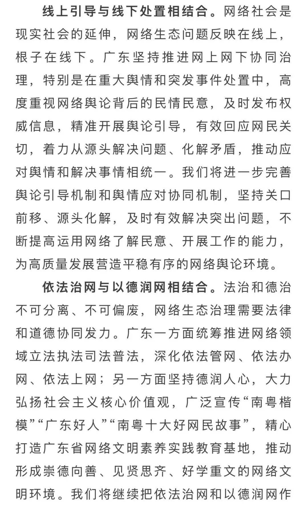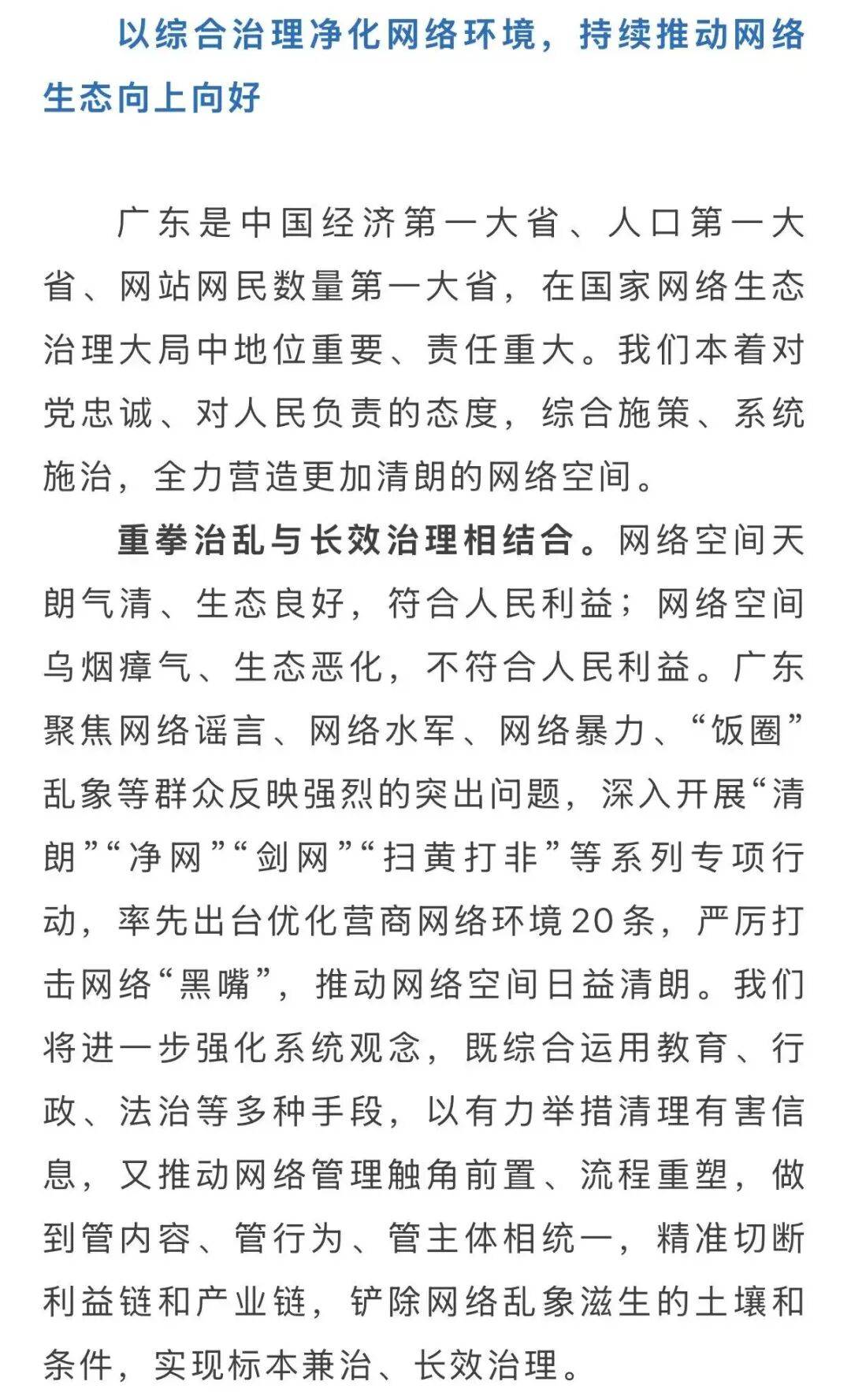 习近平总书记在中共中央政治局第二十三次集体学习时发表重要讲话,深刻阐明加强网络生态治理的重大意义、成效经验、目标方向、主要任务,为我们做好网络生态治理工作提供了思想指引和行动指南。网络生态治理是网络强国建设的重要任务,事关国家发展和安全、事关人民群众切身利益。广东始终坚持以习近平新时代中国特色社会主义思想特别是习近平文化思想、习近平总书记关于网络强国的重要思想为指导,深入学习贯彻习近平总书记对广东系列重要讲话和重要指示精神,自觉站在“过不了互联网这一关,就过不了长期执政这一关”的政治高度,坚决扛起互联网大省的政治责任,坚持正能量是总要求、管得住是硬道理、用得好是真本事,以走在前、作示范、挑大梁的责任担当推进网络生态治理,奋力为网络强国建设作出广东贡献。