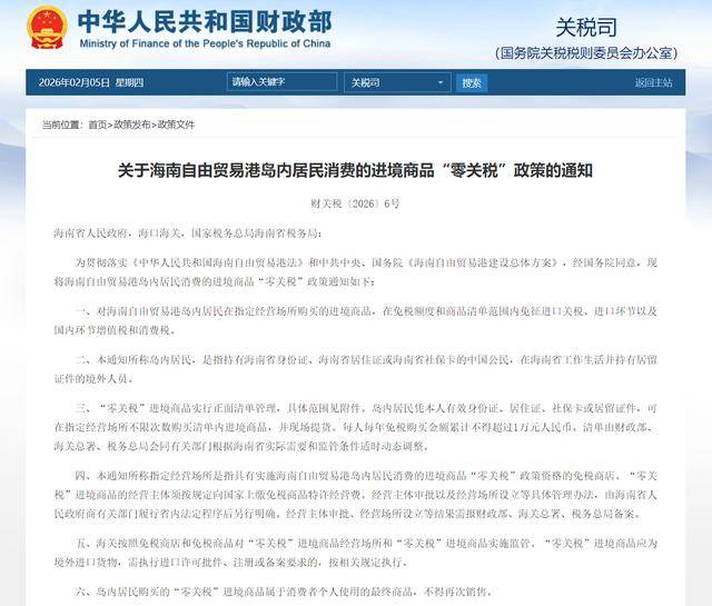 2月5日,财政部、海关总署、税务总联合发布《关于海南自由贸易港岛内居民消费的进境商品“零关税”政策的通知》。政策规定,对海南自由贸易港岛内居民在指定经营场所购买的进境商品,在免税额度和商品清单范围内免征进口关税、进口环节以及国内环节增值税和消费税。其中,岛内居民包括持有海南省身份证、海南省居住证或海南省社保卡的中国公民,在海南省工作生活并持有居留证件的境外人员。免税额度为每人每年1万元人民币,不限购买次数。免税商品聚焦岛内居民日常生活所需,主要包括部分食品饮料、日化用品、家居百货、母婴用品等。