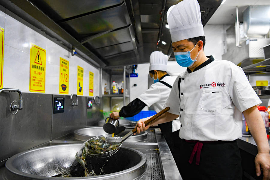 2月7日上午9时,华铁旅服公司“华东印记”虹桥站店主题餐厅的厨房已热火朝天。厨师长王坤带领着团队,正在紧张而专注地制作各种热链餐食。