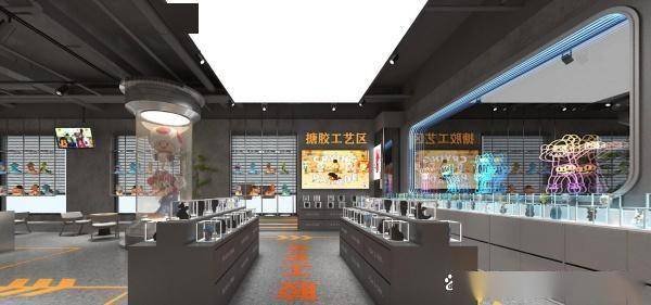 潮玩展厅搪胶工艺区 这里聚焦于以搪胶材质制作的潮玩,这类产品通常手感柔软、造型圆润,是潮玩中极具代表性的品类之一。 中间的开放式展柜采用分层设计,内置柔和灯光,能清晰展示搪胶潮玩的色彩与质感。右侧的弧形展示墙搭配霓虹风格的艺术装置,既突出了展品,又营造出潮流打卡氛围。左侧的透明圆柱展柜则用来展示大型搪胶潮玩,成为视觉焦点。