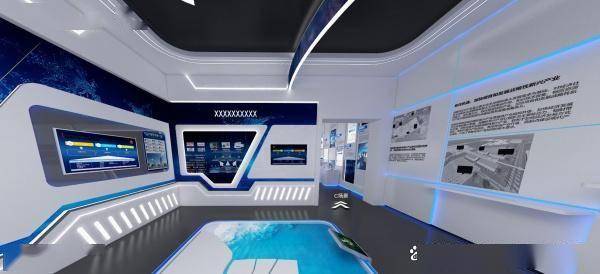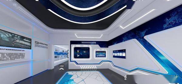 科技企业展厅的收尾展望区 呼应了 “展望未来” 的主题。墙面的蓝色发光线条勾勒出科技感十足的框架,与右侧的放射状发光门形成视觉呼应,强化了空间的仪式感。