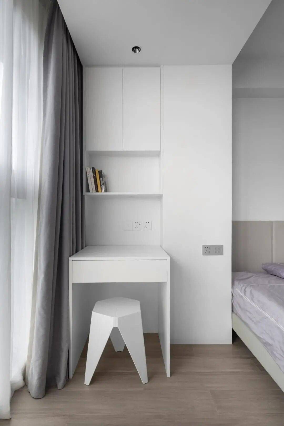 次卧一部分空间挨着阳台,就把阳台一半的面积包了进来,设计了一个备用的书桌。