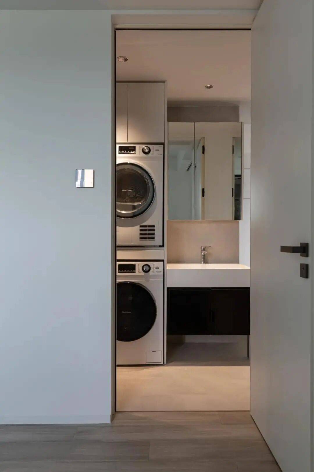 干区,得以拥有更大更好用的洗漱区,还有充足的镜柜做收纳,其次还设计了洗衣机、烘干机的摆放区域,节约了阳台的晾晒面积,对于潮湿闷热的深圳来说,好处太多。