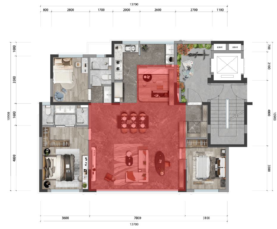 ③拆掉公区卫生间,让餐客厅升级为55㎡超大空间(独栋别墅才享有的大空间)