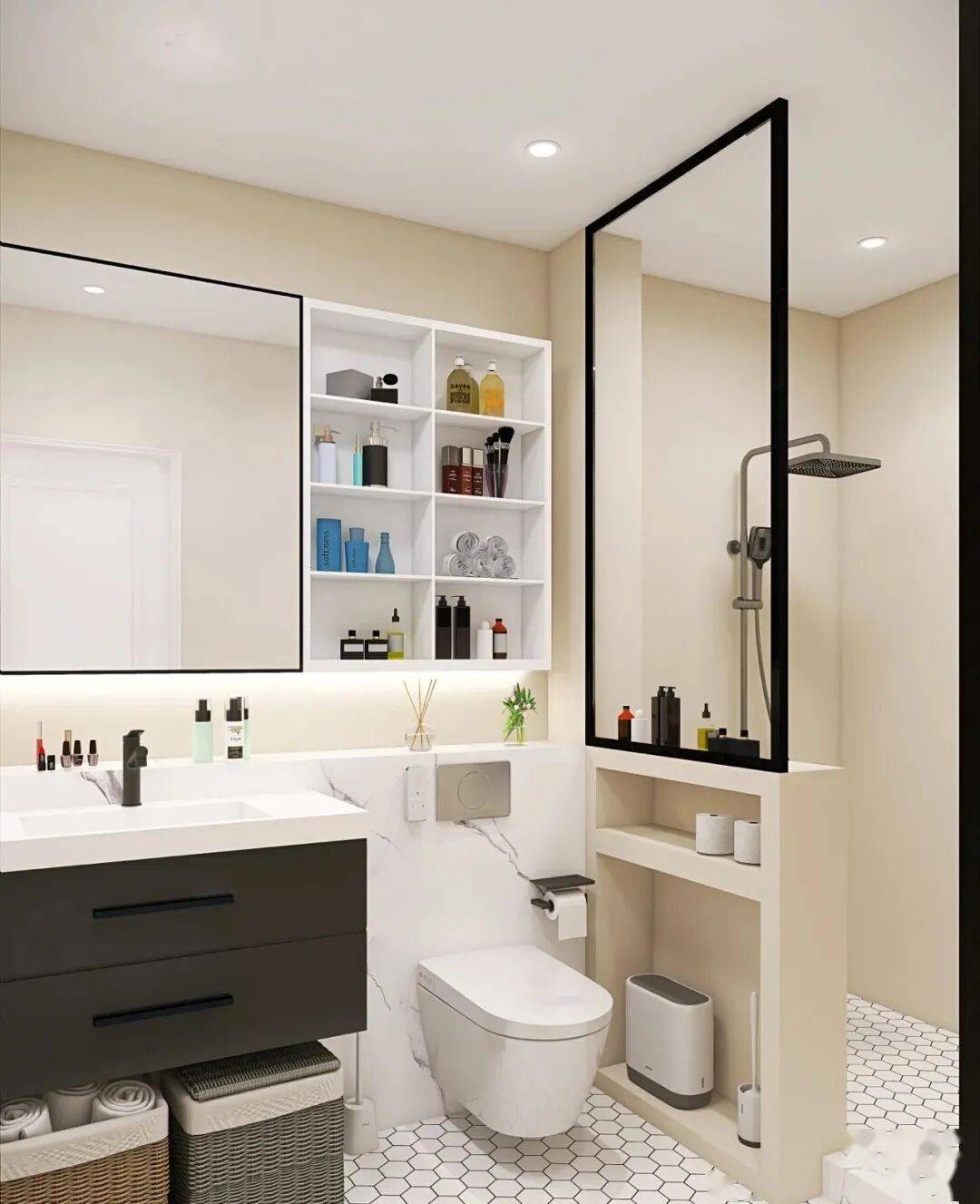 在淋浴区和马桶区中间,砌一道1米左右高的矮墙,既能起到隔断的作用,壁龛还能用来放置纸巾、纸篓、洗漱用品等,既实现了分区功能,又增加了储物空间,特别适合那些需要多功能收纳空间的家庭。