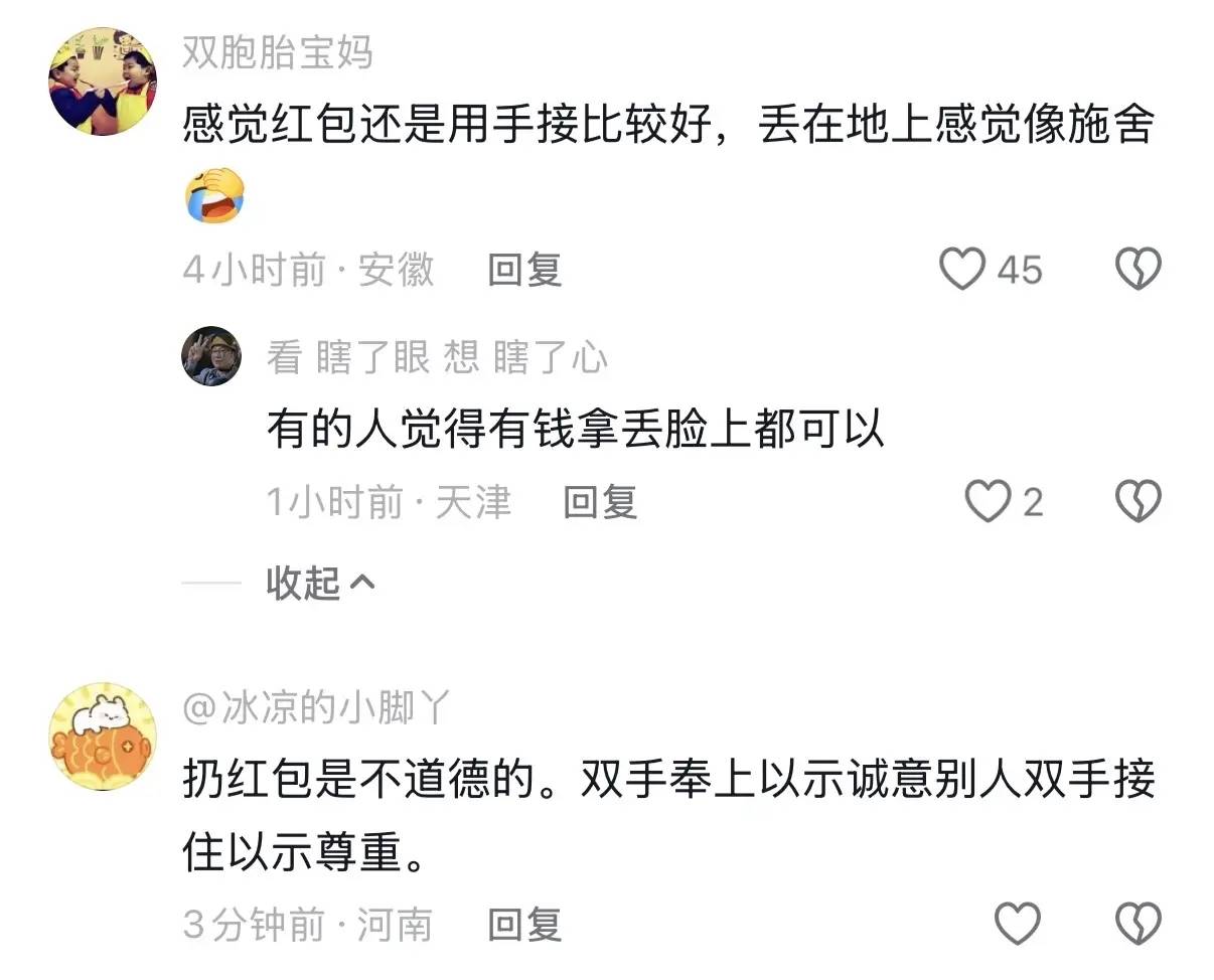 有人说:跪拜是礼节,红包扔地上像“打赏”,礼貌被动作消解了。