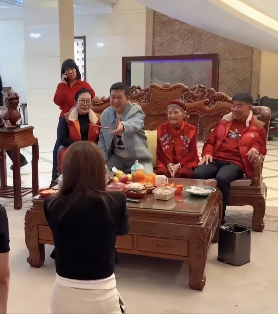 杨子和母亲坐在中间,旁边还坐着大哥大嫂,几个人几乎清一色喜庆红,只有杨子一身牛仔,像刚从综艺里下班。