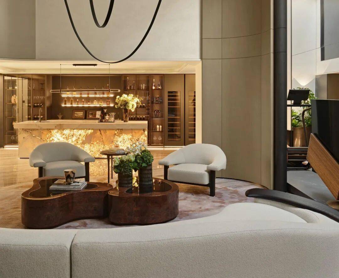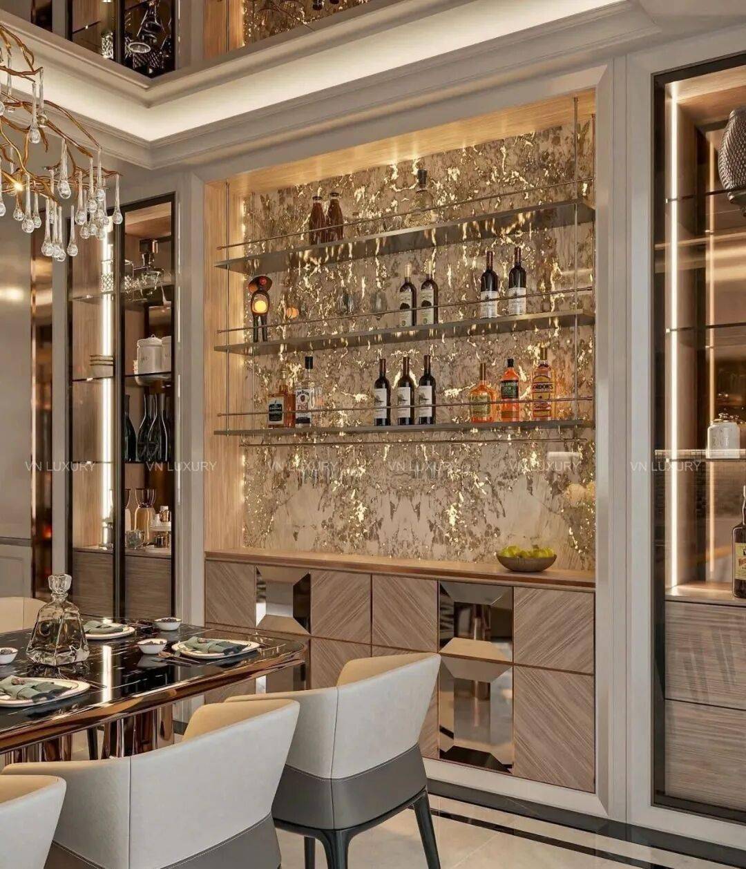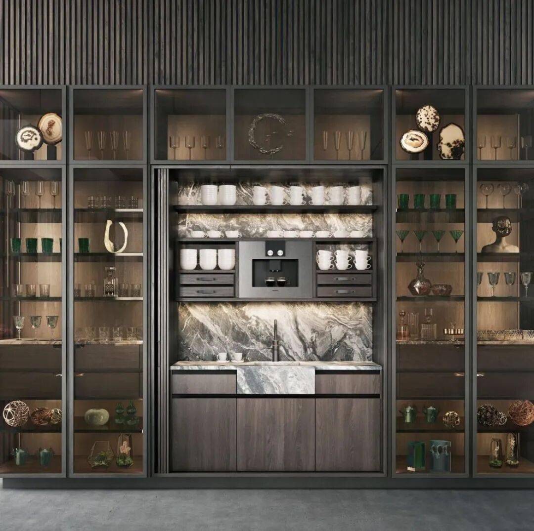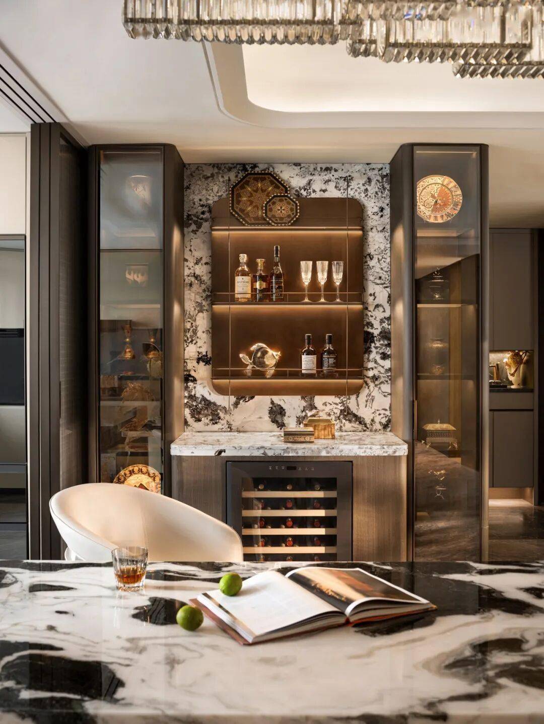 封闭式收纳则兼顾整洁与美观,木质柜门与玻璃门的组合,既能隐藏杂物,又能展示精致的酒具与藏品。