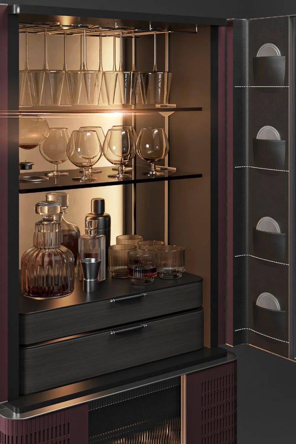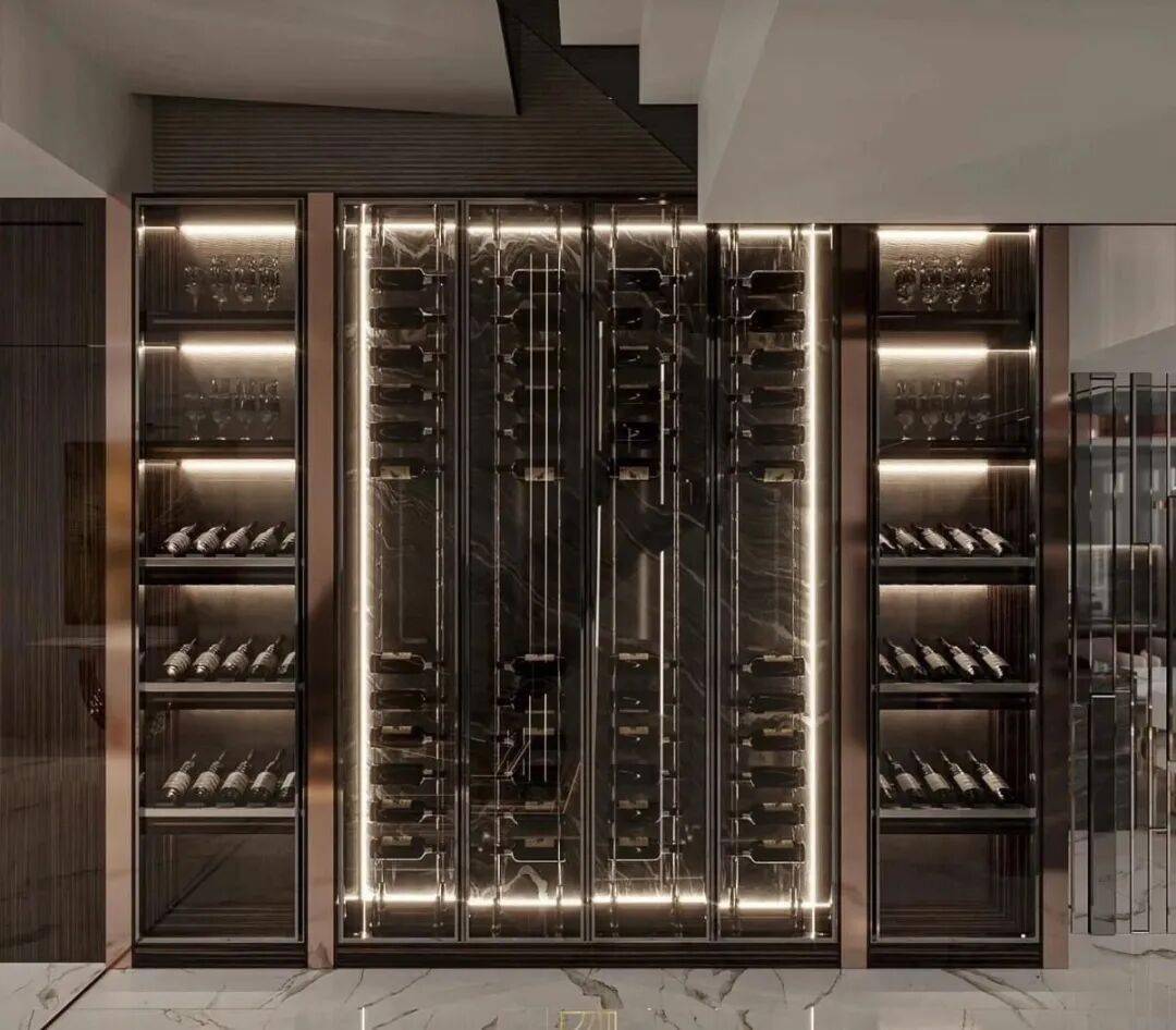 开放式层架设计,将酒瓶、酒杯与装饰摆件有序陈列,通透玻璃与灯带结合,让美酒成为家中最动人的风景。