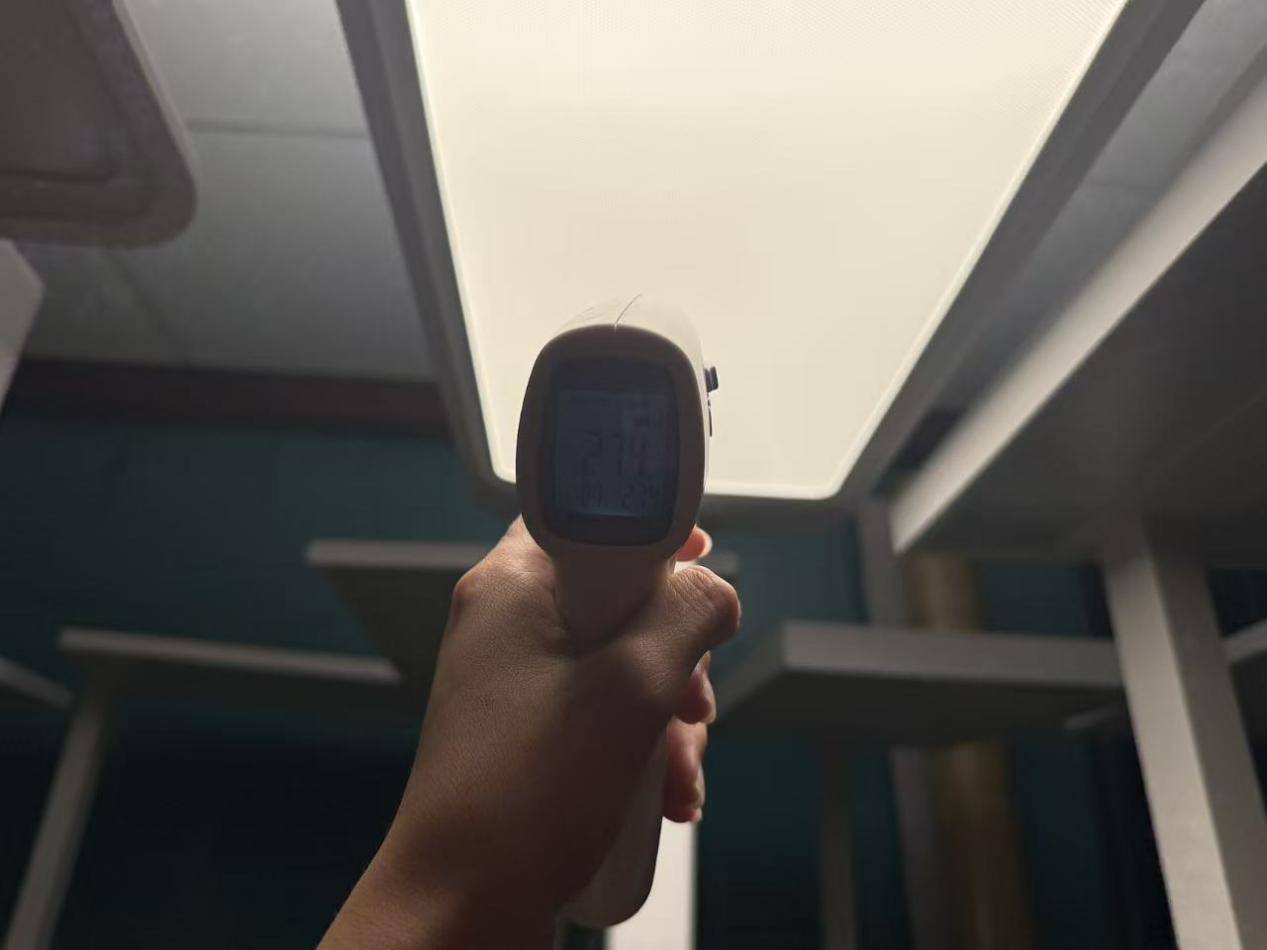 实测方法:将护眼大路灯调节至最高亮度,在无其他灯光的情况下,连续性开一小时后采用温度器实测出发光面温度。