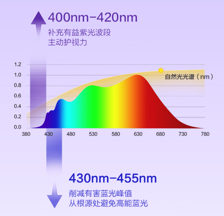 相比容易产生有害蓝光的蓝光全光谱来说,紫光全光谱更接近太阳光,光谱中415-455nm有害蓝光含量更少,光谱连续性更佳,显色指数可轻松达到Ra≥98,光线更柔和自然,同时,紫光激发光源通过长期临床验证,不仅能缓解眼疲劳,还能有效控制眼轴过度增长,预防近视恶化。因此,在选择护眼台灯时,优选紫光激发光源,才能真正做到从光源开始保护眼睛。