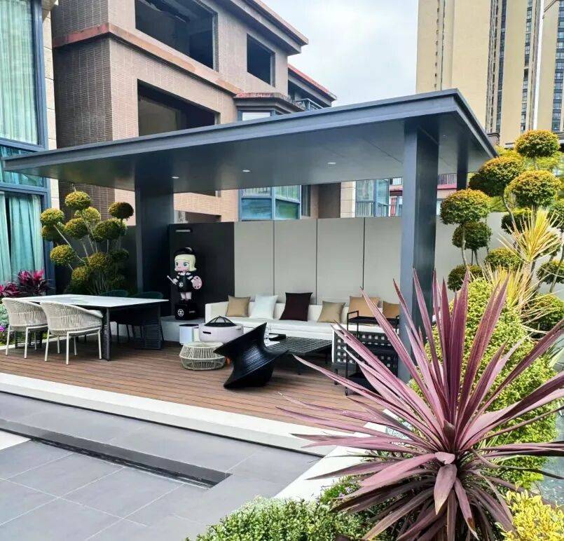 新中式风格+铝合金凉亭 -新中式风格而且面积较大的庭院想要使用铝合金凉亭,可以参考下面这款,廊架顶端为智能遮阳帘,可以根据需求选择打开或者关闭,使用起来十分方便。廊架下再搭配上显大气的户外沙发家具,提升庭院的高级感。