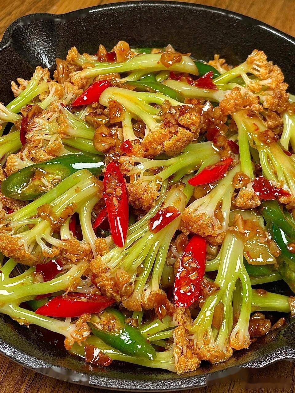 3、倒入花菜,加入1勺盐、少许白糖、1勺生抽、1勺蚝油,放入小米辣和蒜苗叶,大火翻炒均匀即可出锅。