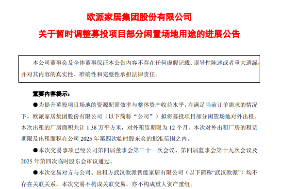 11月25日,欧派家居发布《关于暂时调整募投项目部分闲置场地用途的进展公告》称,为提升资源配置效率与资产收益水平,公司拟将“欧派家居智能制造(武汉)项目”部分闲置场地对外出租。