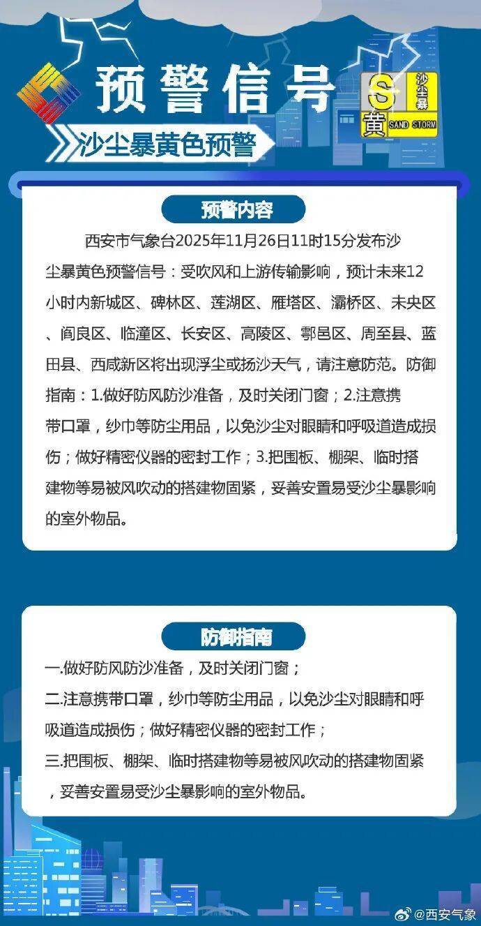 受吹风和上游传输影响,预计未来12小时内新城区、碑林区、莲湖区、雁塔区、灞桥区、未央区、阎良区、临潼区、长安区、高陵区、鄠邑区、周至县、蓝田县、西咸新区将出现浮尘或扬沙天气,请注意防范。