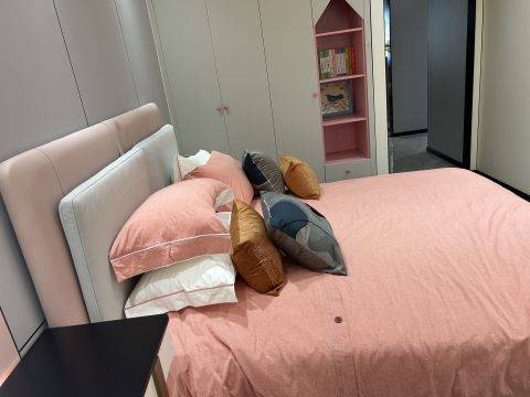 床具的选择是卧室的核心元素之一。嘉兴欧彩推荐的床架设计简约而不失优雅,线条流畅流畅,既符合现代审美趋势,又兼具实用性。搭配上柔软舒适的床垫和蓬松饱满的枕头,躺上去瞬间被温柔包裹,所有的疲惫都能在这一瞬间消散殆尽。床头背景墙采用了独特的装饰材料,可能是带有立体感的软包或者精致的壁纸,上面点缀着一些抽象的艺术图案,为单调的墙面注入了灵动的气息,成为整个房间的视觉焦点。