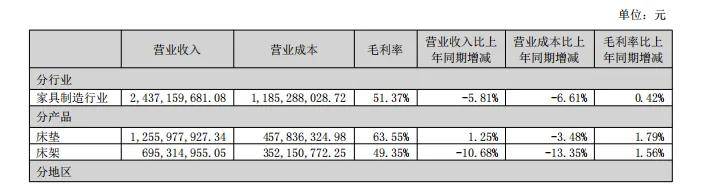 慕思的核心产品床垫上半年收入12.56亿元,同比增长1.25%,毛利率提升至63.55%,仍保持较高水平。