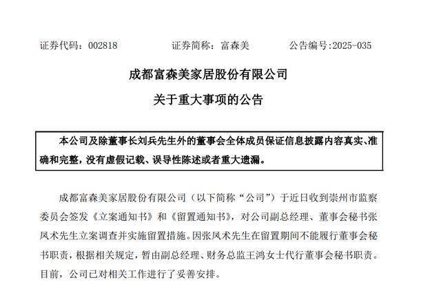 11月25日,富森美(002818.SZ)发布公告,公司收到崇州市监察委员会签发《立案通知书》和《留置通知书》,对公司副总经理、董事会秘书张凤术立案调查并实施留置措施。