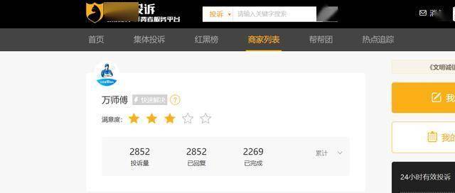 据黑猫投诉平台显示,万师傅累计投诉达2852条,已完成2269条。近一个月投诉量达122条。