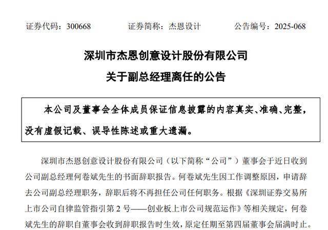 11月24日,杰恩设计(300668.SZ)发布公告,何卷斌因工作调整原因,申请辞去公司副总经理职务,辞职后将不再担任公司任何职务。