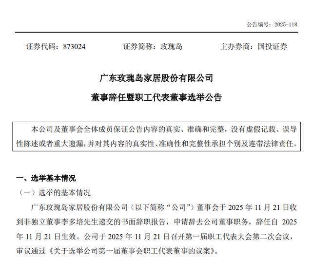 11月25日,玫瑰岛(873024.NQ)发布公告,公司收到非独立董事李多培递交的书面辞职报告,申请辞去公司董事职务。同时,经职工代表民主选举,选举李多培为公司职工代表董事。