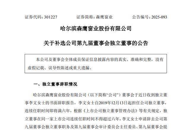 11月24日,森鹰窗业(301227.SZ)发布公告,经公司第九届董事会提名委员会资格审查,董事会提名李沐瑶为公司第九届董事会独立董事候选人,并在股东会选举通过后一并担任公司第九届董事会审计委员会主任委员、第九届董事会提名委员会委员职务。