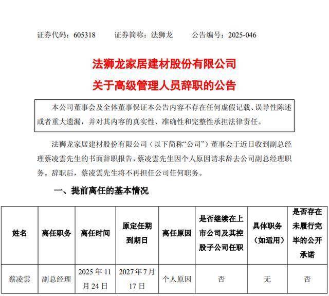 11月24日,法狮龙(605318.SH)发布公告,蔡凌雲因个人原因请求辞去公司副总经理职务。辞职后,蔡凌雲将不再担任公司任何职务。